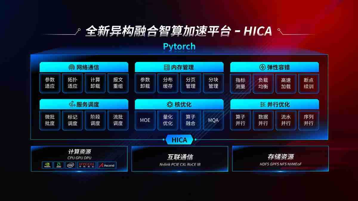 通过自研的服务层、、中间适配层、、以及调度编排算法,,采用数据并行、、模型并行等多种并行方式,,,把并行计算任务进行有效的分解,,,使其分别由相应的软件栈和算力资源来承接。。。当GPU资源变化,,,HICA可以实时动态调度计算子任务并调整模型拓扑和架构,,,以充分聚合各种算力资源。。。。