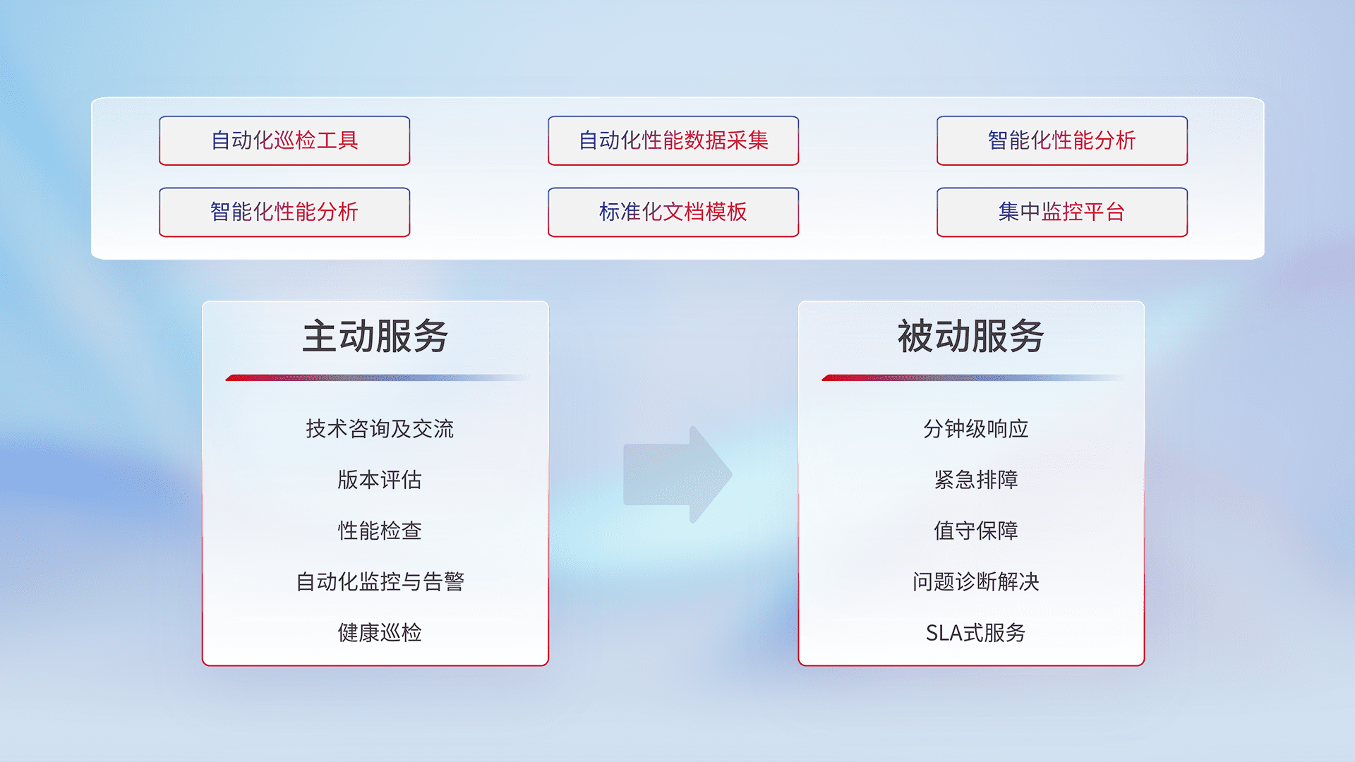 智能化工具和标准化文档,,,,保障服务质量,,,,提供主动服务(包含技术咨询、、版本评估、、性能检查、、、、自动化监控与告警、、、健康巡检)和被动服务包含(分钟级响应、、、、紧急排障、、值守保障、、、、问题诊断解决、、SLA服务)。。。。